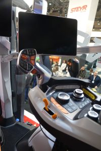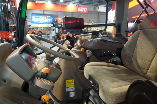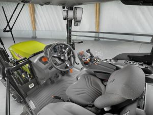 La cabina a quattro montanti, con sistema di filtrazione categoria 4, consente una visibilità panoramica senza ostacoli e un accesso ampio e sicuro. Dentro la cabina troviamo un sedile premium con sospensione a bassa frequenza ad aria e bracciolo multifunzionale integrato con Cmotion ed Electropilot (bracciolo fissato alla console destra nella versione S), mentre il sistema Dynamic Steering consente di ridurre le rotazioni del volante.