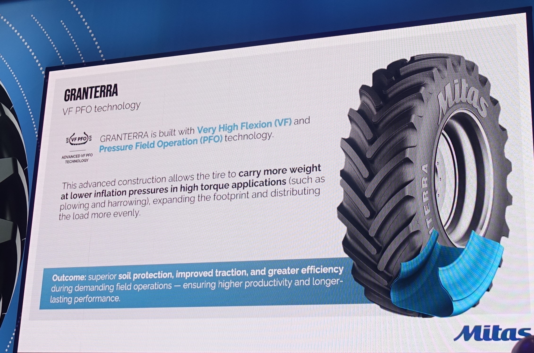 Nel decimo anniversario della sua acquisizione da parte di Trelleborg (entrambi i brand sono poi confluiti in Yokohama tre anni fa), Mitas ha lanciato ad Agritechnica 2025 la gamma Granterra, sviluppata per rispondere alle esigenze in continua evoluzione dell’agricoltura moderna, in cui efficienza, protezione del suolo e produttività devono procedere di pari passo. Grazie alla tecnologia avanzata VF PFO (Very High Flexion – Pressure Field Operation), alla struttura della carcassa avanzata e a un battistrada completamente nuovo, la nuova linea di pneumatici Mitas è stata progettata per offrire massime prestazioni là dove contano di più: sul campo. Ogni dettaglio dello pneumatico è stato studiato per massimizzare la trazione, proteggere il suolo e garantire prestazioni costanti anche nelle condizioni di lavoro più impegnative.